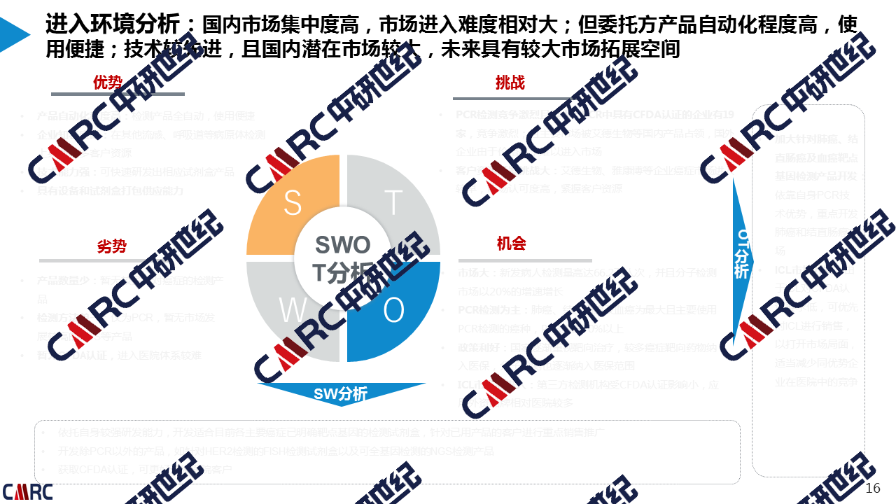 研究成果:1、中國腫瘤分子檢測的檢測流程、特征、檢測費(fèi)用、需求特征; 2、中國腫瘤分子檢測市場規(guī)模:包含整體市場規(guī)模、各種分子檢測的市場規(guī)模細(xì)分以及未來市場的發(fā)展?jié)摿Γ?3、中國腫瘤分子檢測市場競爭格局、各企業(yè)的優(yōu)劣勢、產(chǎn)品特點(diǎn)以及價(jià)格情況; 4、重點(diǎn)企業(yè)信息:產(chǎn)品、價(jià)格、銷售策略等、銷售模式等 5、進(jìn)入中國市場的建議。