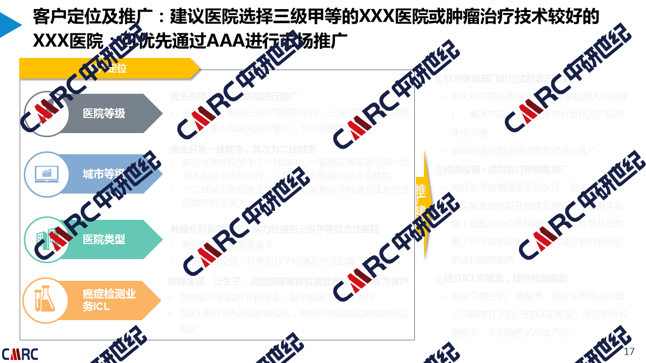 服務(wù)內(nèi)容:通過腫瘤科室醫(yī)生訪談及競品研究,獲取下述內(nèi)容 1、各類腫瘤疾病發(fā)病情況、病患特征及趨勢; 2、腫瘤確診流程及治療流程,其中應(yīng)用的檢測手段及指標(biāo)定量; 3、癌腫瘤臨床診斷和疾病監(jiān)測過程中的痛點(diǎn); 4、腫瘤檢測終端收費(fèi)水平; 5、腫瘤檢測市場競爭態(tài)勢。