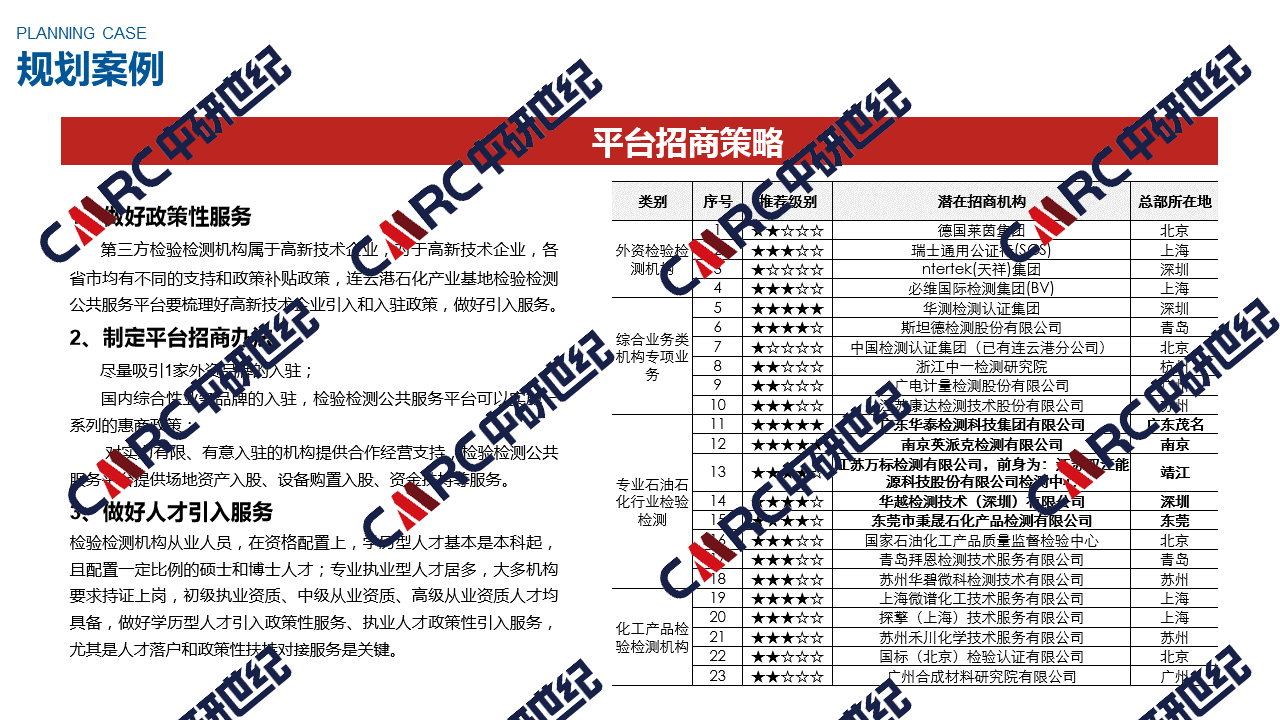 1、市場調(diào)研:對國內(nèi)、區(qū)域范圍內(nèi)、省域及連云港當?shù)氐漠a(chǎn)業(yè)市場情況進行詳細調(diào)研 行業(yè)研究:國內(nèi)外及省域行業(yè)市場情況研究,包括龍頭企業(yè)情況; 競合調(diào)研:周邊及省域競爭環(huán)境及合作情況進行研究,論證石化基地需求的真實性; 標桿研究:對代表性石化基地舟山園區(qū)及檢驗檢測服務(wù)等進行系統(tǒng)研究,需求具有可借鑒性。 2、規(guī)劃服務(wù):項目建議書、可行性研究、總體策劃(策劃規(guī)劃雙規(guī)合一) 項目建議書:結(jié)合調(diào)研報告,對項目發(fā)展背景、項目功能、市場需求、平臺內(nèi)容、發(fā)展策略給出具體建議。 可行性研究報告:結(jié)合調(diào)研報告,對建設(shè)必要性、建設(shè)內(nèi)容、合作方式、服務(wù)內(nèi)容、規(guī)劃設(shè)計、投融等進行系統(tǒng)的可行性研究。 項目總體策劃:結(jié)合市場和案例研究,對產(chǎn)業(yè)選擇、業(yè)態(tài)規(guī)劃、細分項目、建設(shè)設(shè)計、投資預算等進行了系統(tǒng)的策劃和規(guī)劃,指導項目的開發(fā)。