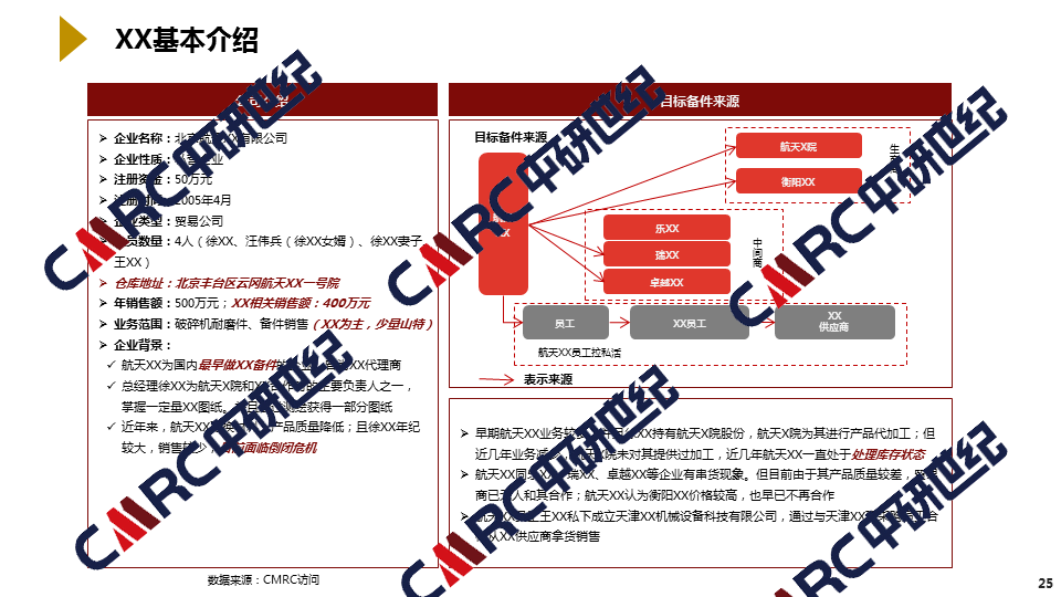 客戶(hù)的圓錐破碎機(jī)產(chǎn)品備件技術(shù)含量高,價(jià)值高,正常備件必須從原廠購(gòu)買(mǎi)。但市面上出現(xiàn)一些企業(yè)開(kāi)始仿制、進(jìn)行銷(xiāo)售。本次項(xiàng)目將針對(duì)已知的銷(xiāo)售仿制備件的企業(yè)進(jìn)行研究,調(diào)查其備件來(lái)源及銷(xiāo)售情況。