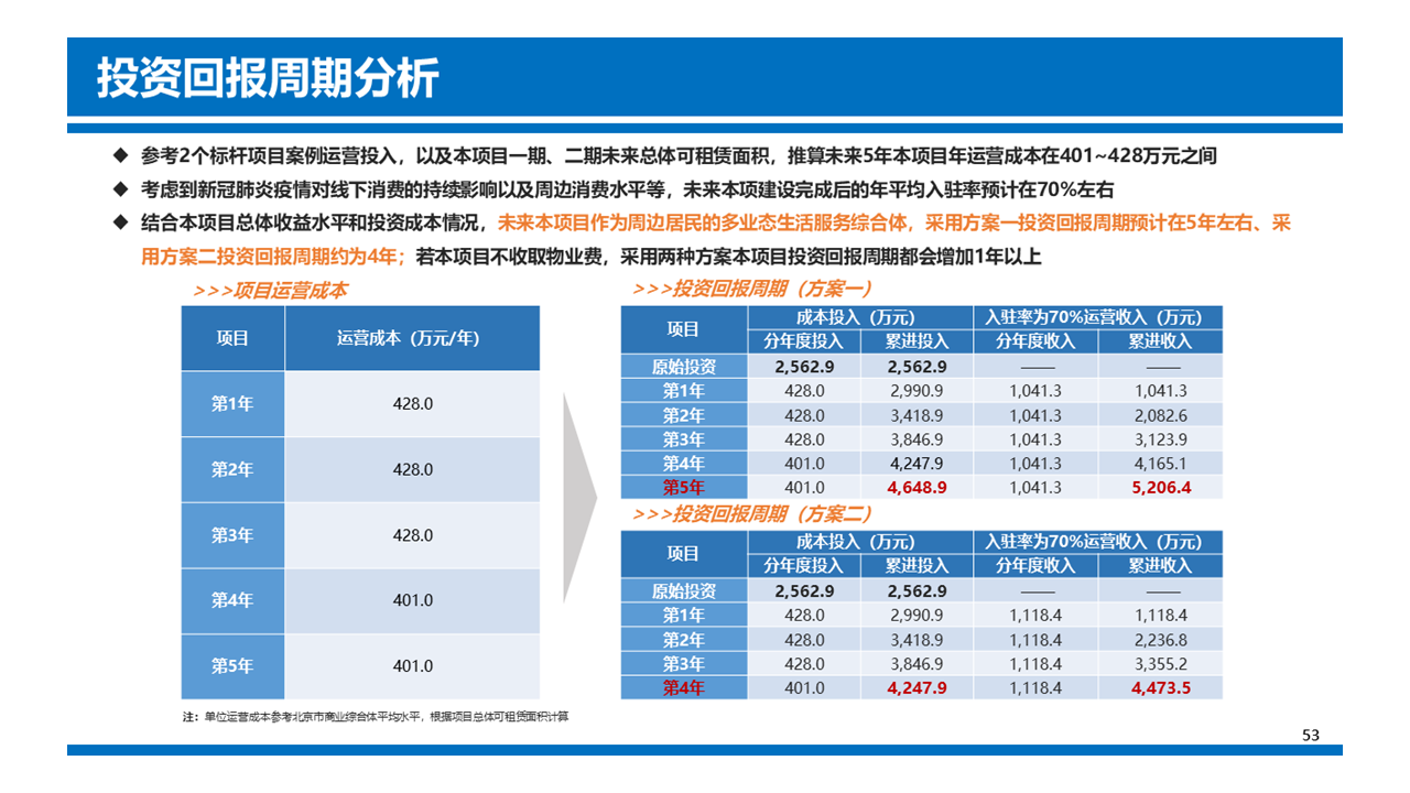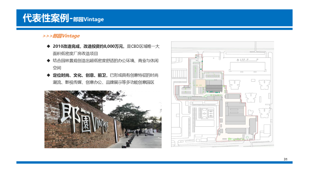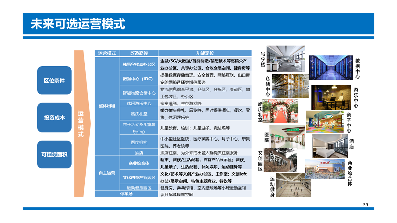 研究總結(jié)分析了辦公、文創(chuàng)、商業(yè)綜合體等多種適合本項目的改造方向,并參考現(xiàn)有案例及標桿商業(yè)體數(shù)據(jù),給出了未來本項目的預(yù)計投資水平和不同改造路徑的收益水平,推算各種業(yè)態(tài)規(guī)劃的投資回收周期,最終給出了多種可選業(yè)態(tài)的改造方向優(yōu)先度,為委托方后期改造提供支持和參考。
