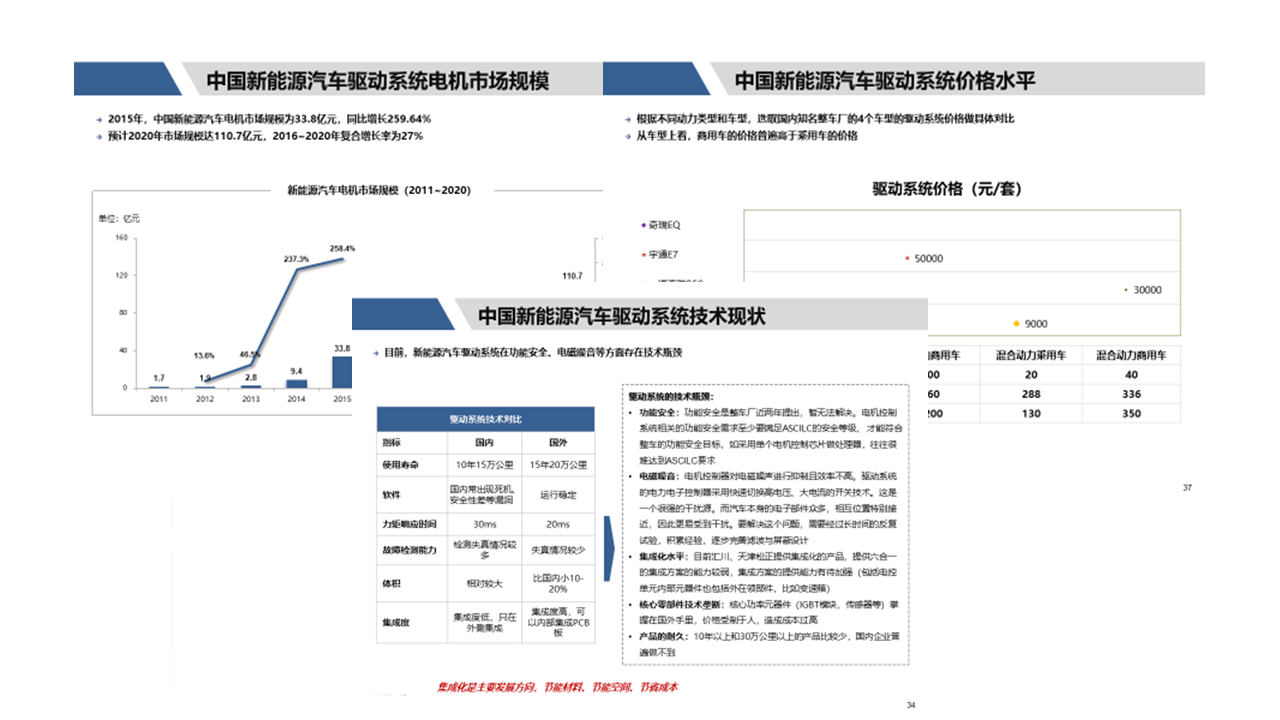 驅(qū)動(dòng)系統(tǒng)(電機(jī)+電機(jī)控制器);關(guān)鍵零部件(薄膜電容器、電機(jī)、IGBT及驅(qū)動(dòng)、傳感器(電壓、電流)、接插件、變速箱、電池及電池管理系統(tǒng)的市場可行性分析。