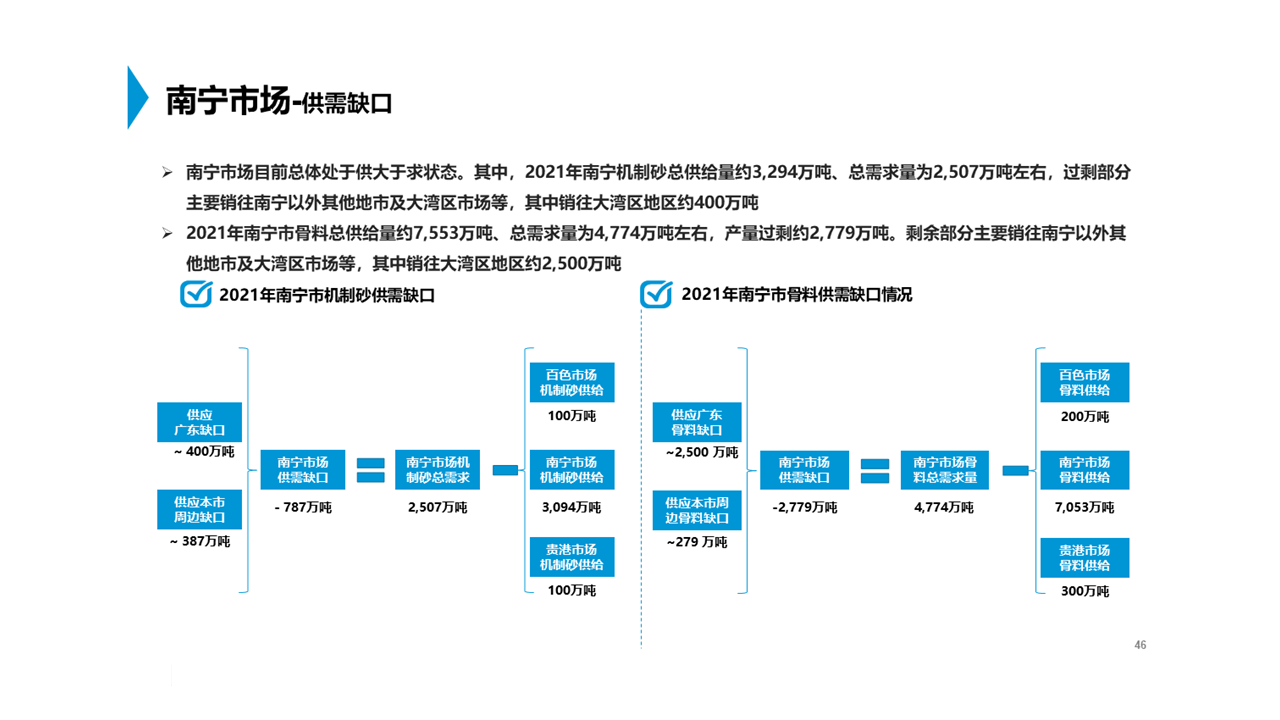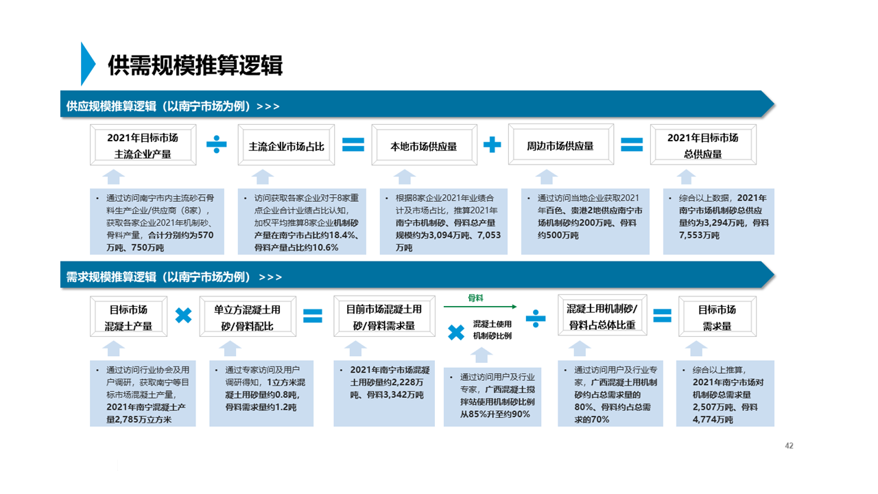 客戶需求:委托方下屬產(chǎn)業(yè)投資公司計(jì)劃參與廣西南寧地區(qū)的一處石灰?guī)r礦山投資,未來將開展機(jī)制砂、骨料等綠色建材的開采加工,想通過第三方的獨(dú)立客觀調(diào)研,分析該項(xiàng)目周邊主要市場的現(xiàn)有砂石骨料的供需規(guī)模、價(jià)格水平等,評(píng)估該項(xiàng)未來的預(yù)期收益,并圈定主要目標(biāo)市場范圍。