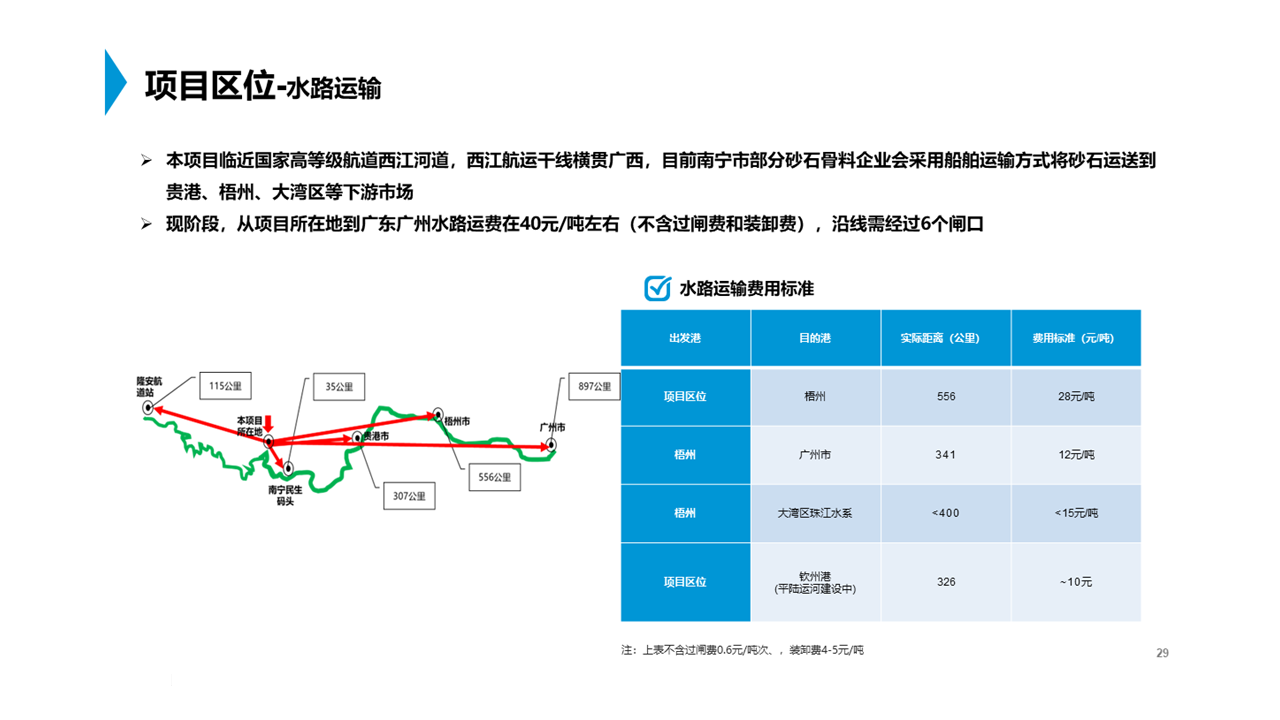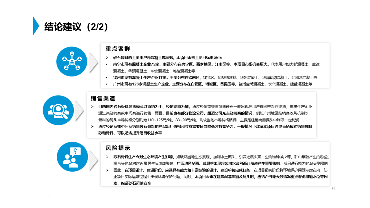 研究成果:通過對(duì)項(xiàng)目地到周邊主要需求市場的運(yùn)輸條件、產(chǎn)品預(yù)期收益等,確定了未來本項(xiàng)目機(jī)制砂和骨料產(chǎn)品的重點(diǎn)市場為南寧、廣州等城市,并根據(jù)各市場的競爭環(huán)境、供需缺口和發(fā)展趨勢等,給出本項(xiàng)目未來的生產(chǎn)規(guī)模、重點(diǎn)客群、產(chǎn)品定價(jià)、運(yùn)輸方式、銷售渠道等方面的建議。