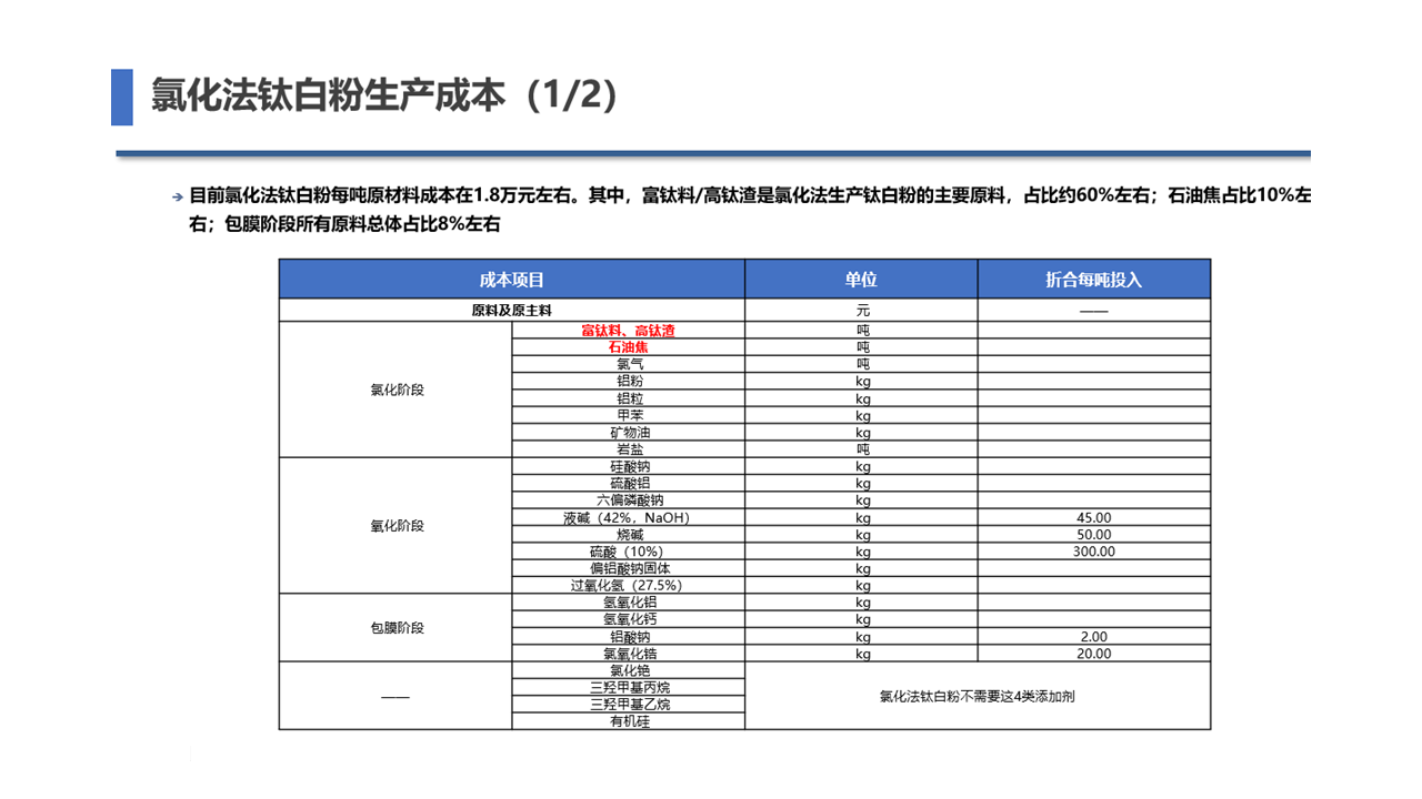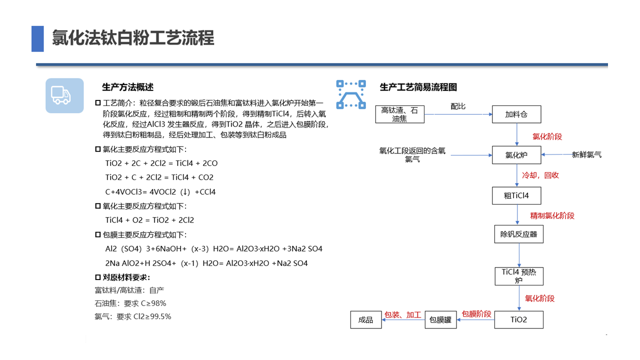 委托方計(jì)劃引入氯化法生產(chǎn)鈦白粉,但對(duì)該產(chǎn)品的工藝流程和成本結(jié)構(gòu)等不甚了解,想通過(guò)第三方調(diào)研已使用該工藝的業(yè)內(nèi)龍頭企業(yè),為自身的業(yè)務(wù)發(fā)展提供參考借鑒。