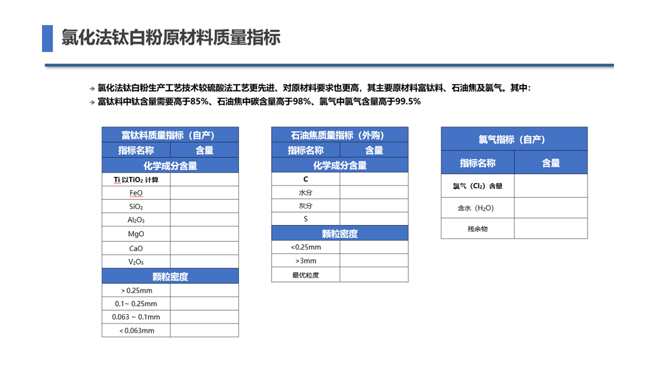 對(duì)標(biāo)企業(yè)氯化法鈦白粉的生產(chǎn)工藝流程、原材料指標(biāo)要求、產(chǎn)品成本構(gòu)、設(shè)備運(yùn)行時(shí)間,并分析其產(chǎn)品銷(xiāo)售數(shù)據(jù)、人員薪資結(jié)構(gòu)等。