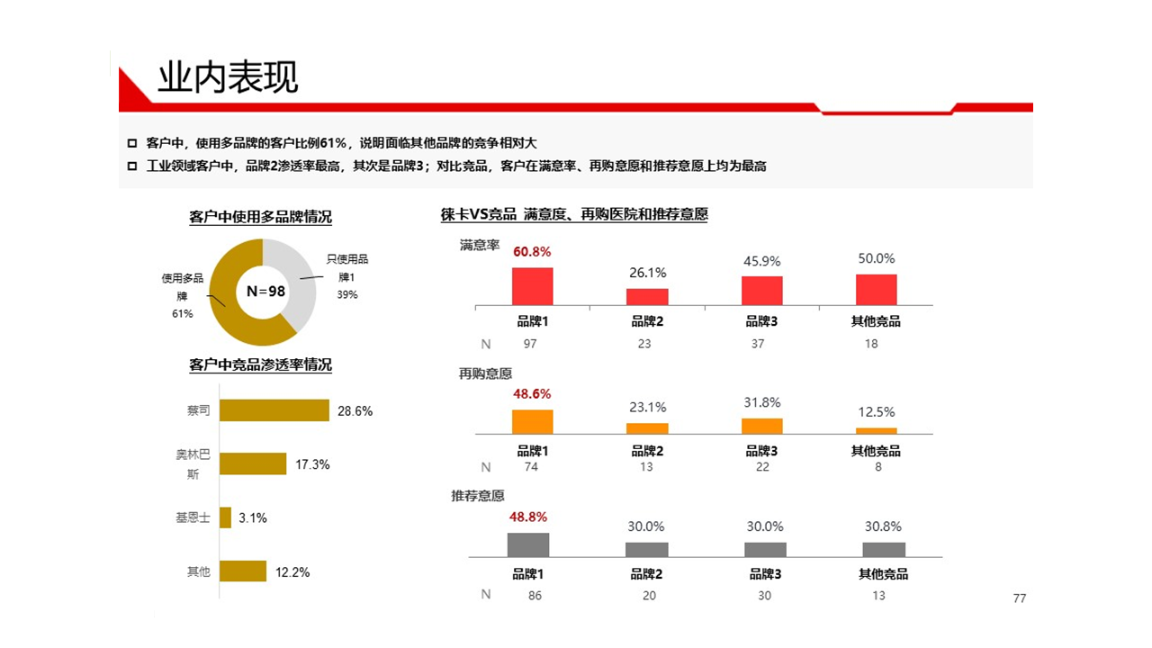對委托方顯微鏡產(chǎn)品下游工業(yè)、醫(yī)療、生命科學(xué)3個領(lǐng)域的用戶開展問卷調(diào)研,讓用戶對其產(chǎn)品使用、市場推廣、銷售服務(wù)和售后服務(wù)4個業(yè)務(wù)環(huán)節(jié)進(jìn)行打分評價,并對于與其他品牌的差異,提升自身產(chǎn)品和服務(wù)水平。