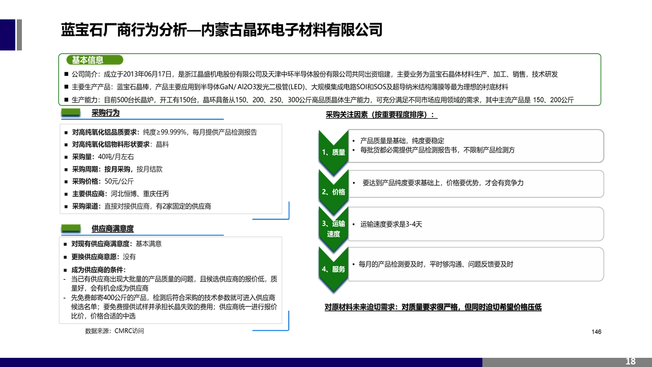 研究成果:對高純氧化鋁市場環(huán)境進行系統(tǒng)分析,為客戶最終決策是否投產(chǎn),提供有效支持依據(jù);同時帶著委托方到藍寶石廠商實地訪談和考察,讓委托方對高純氧化鋁的應用有更清晰的認知,并為后續(xù)開拓客戶資源提供支持。