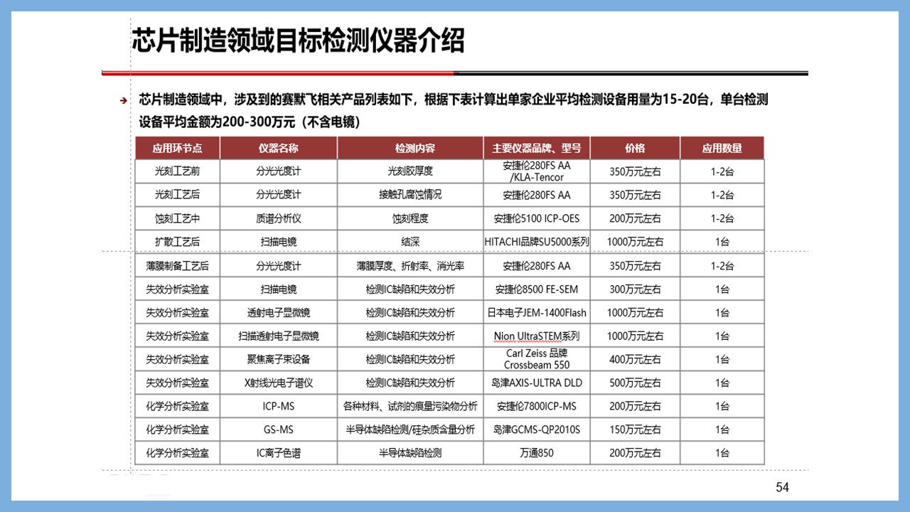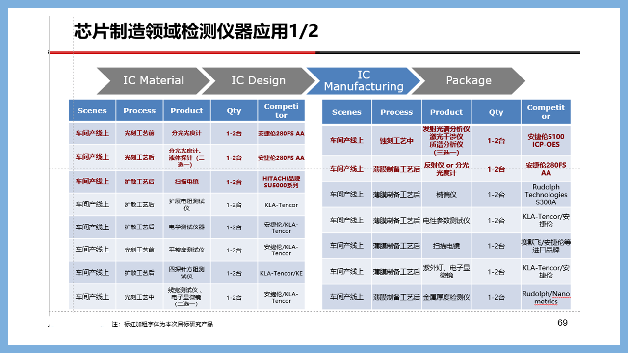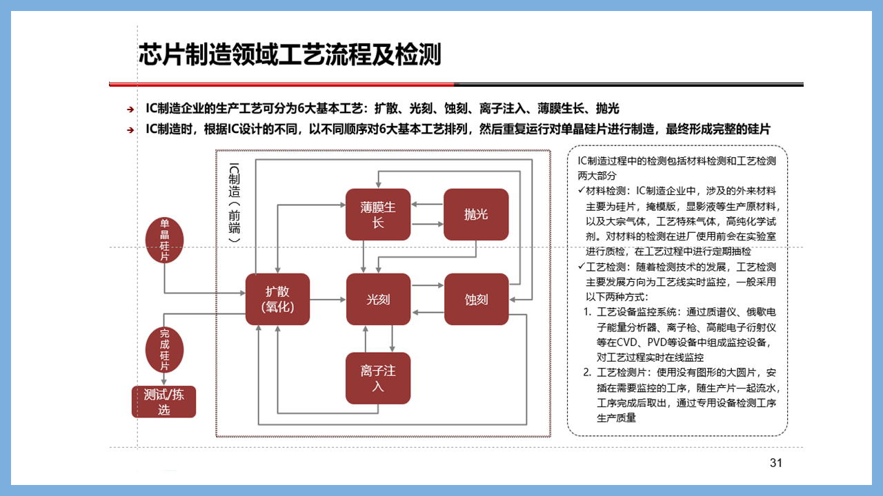 針對晶圓材料生產(chǎn)、IC設(shè)計、IC制造和IC封裝環(huán)節(jié),了解各工序檢測設(shè)備和原輔料檢測設(shè)備的應(yīng)用需求,以便鎖定委托方的應(yīng)用機會點