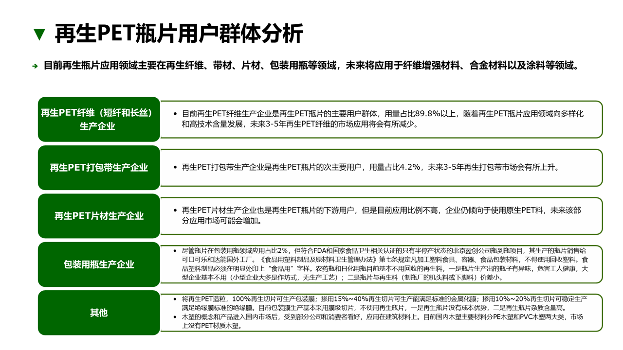 服務(wù)內(nèi)容:(1)市場(chǎng)規(guī)模:中國(guó)市場(chǎng)廢舊PET塑料產(chǎn)量及發(fā)展趨勢(shì);(2)產(chǎn)品及利潤(rùn):廢舊PET塑料及下游應(yīng)用產(chǎn)品的市場(chǎng)價(jià)格及毛利水平(研判產(chǎn)品附加值);廢舊PET塑料及下游應(yīng)用產(chǎn)品的生產(chǎn)工藝和設(shè)備(研判生產(chǎn)難度);(3)客戶特征:用戶需求特征、區(qū)域分布等;采購(gòu)模式;(4)競(jìng)爭(zhēng)態(tài)勢(shì):企業(yè)數(shù)量及區(qū)域分布等。