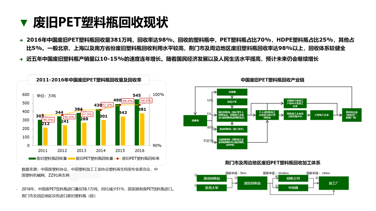 客戶需求:委托方計(jì)劃在荊門(mén)市投資圍繞廢舊PET塑料回收利用的產(chǎn)業(yè)項(xiàng)目,通過(guò)對(duì)荊門(mén)市及周邊區(qū)域的市場(chǎng)調(diào)查,明確廢舊PET塑料的產(chǎn)生量及回收量,回收利用技術(shù)及方法,并對(duì)廢舊原材料的回收處理企業(yè)及下游用戶需求進(jìn)行了解,從而給出產(chǎn)品方向及產(chǎn)能設(shè)計(jì)建議。