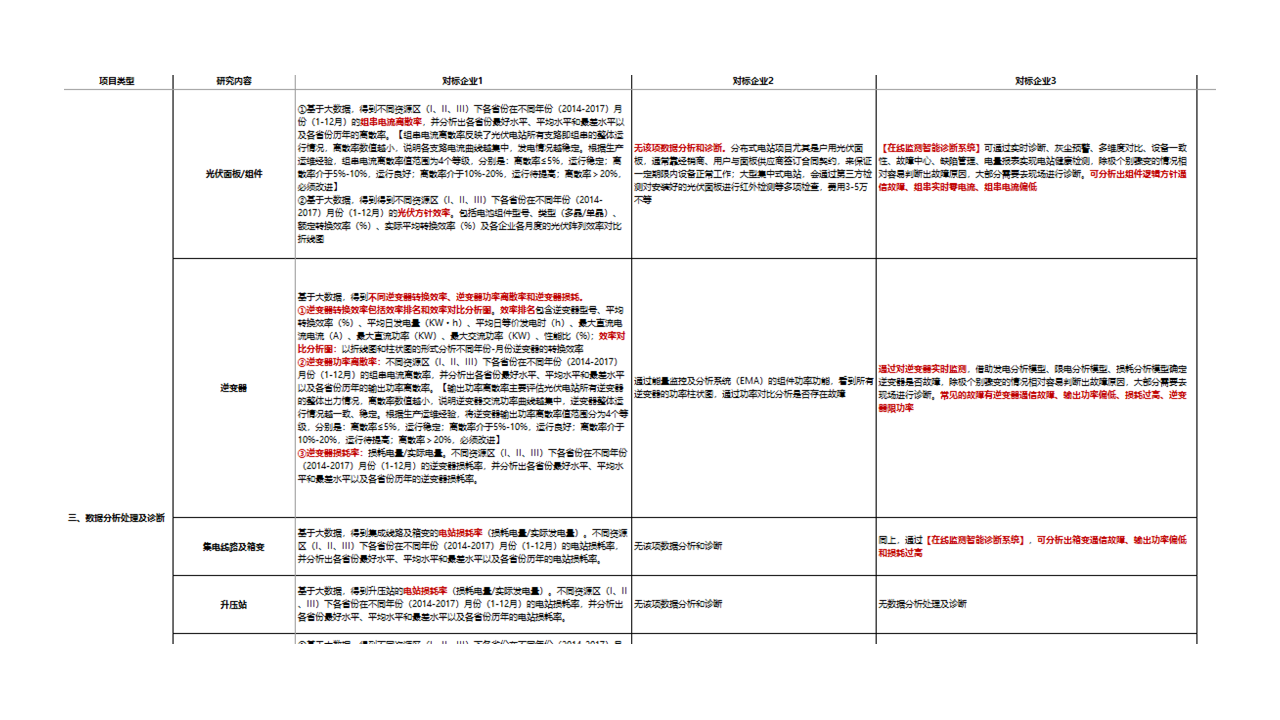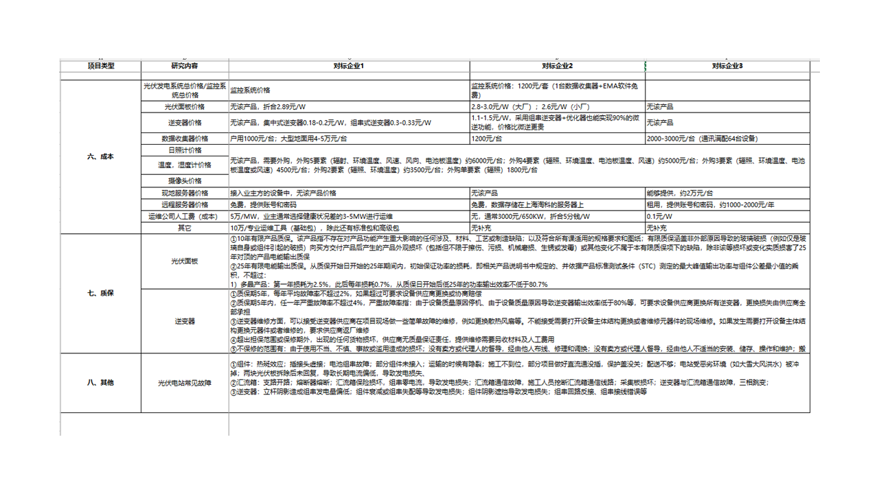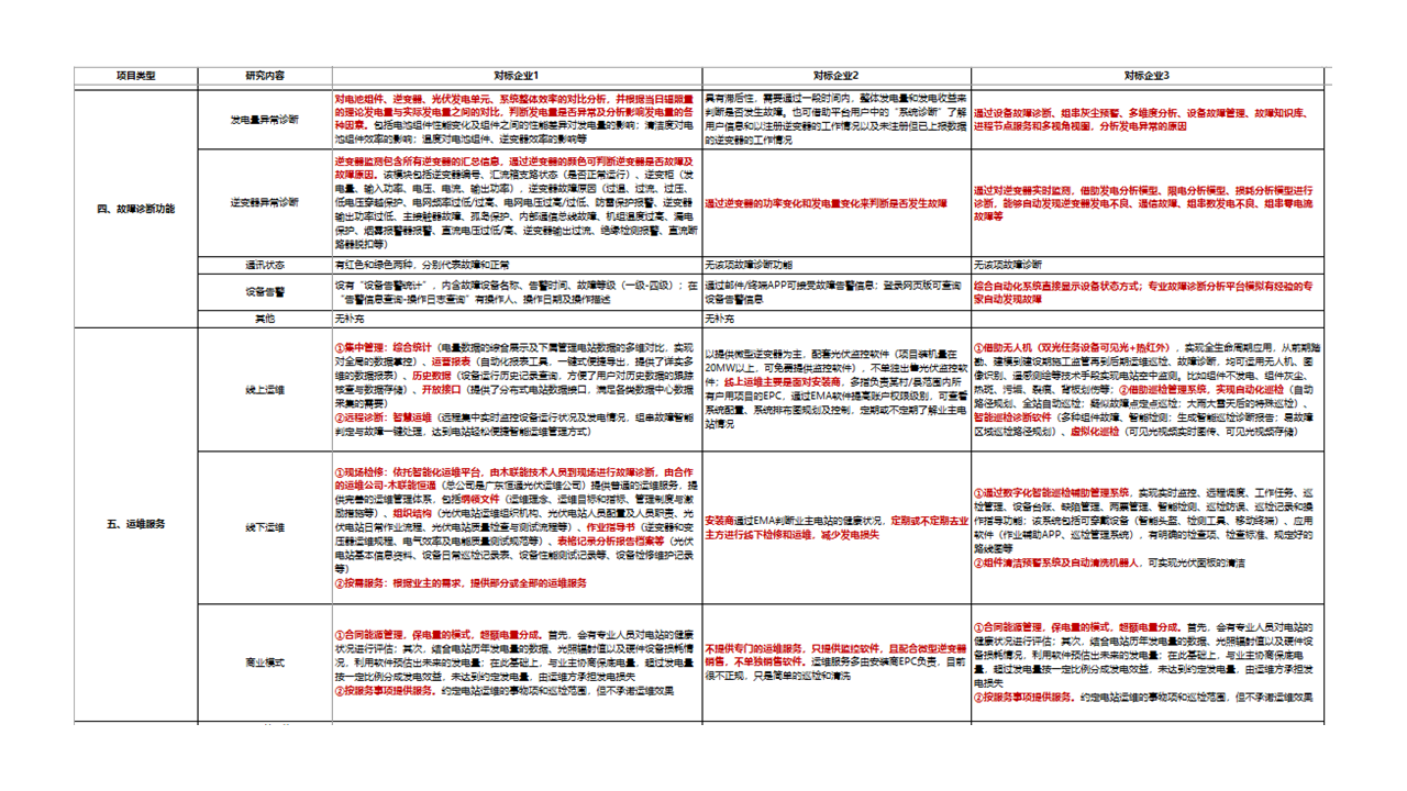 通過對在中國從事PV發(fā)電監(jiān)控系統(tǒng)和運(yùn)維服務(wù)的頭部企業(yè)進(jìn)行調(diào)查,詳細(xì)了解其業(yè)務(wù)運(yùn)營細(xì)節(jié),通過對比判斷自身產(chǎn)品和服務(wù)是否具備進(jìn)入中國市場的條件,以及為后續(xù)合作提供切入點(diǎn)。