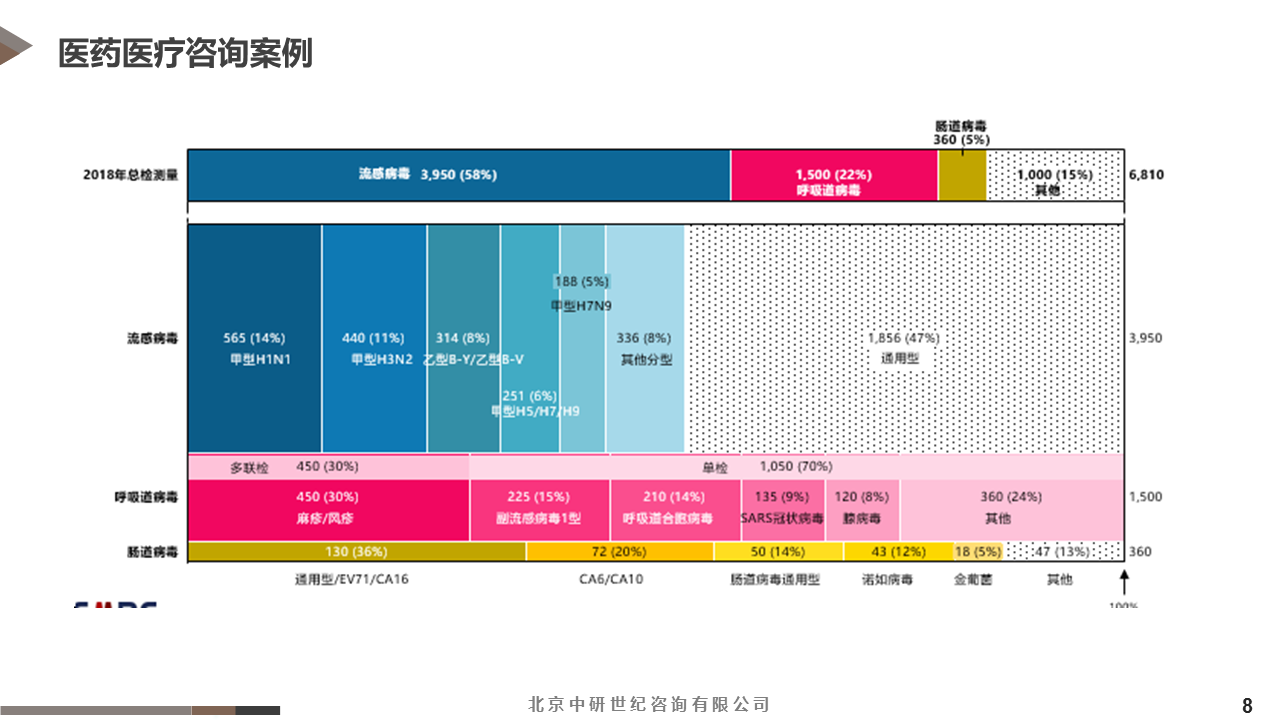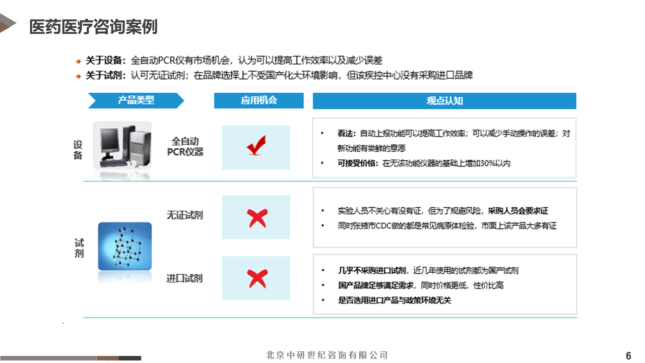 1、通過全國各區(qū)域、各級別疾控部門信息挖掘,幫助委托方,精準定位到高端全自動檢測儀器應用機會(如什么區(qū)域、什么級別疾控中心、什么部門需要此類產品); 2、通過了解各類型傳染性病毒或細菌檢測量及各類型病毒或細菌所用TOP檢測試劑類型,幫助委托方精準定位平臺可開放的模塊。
