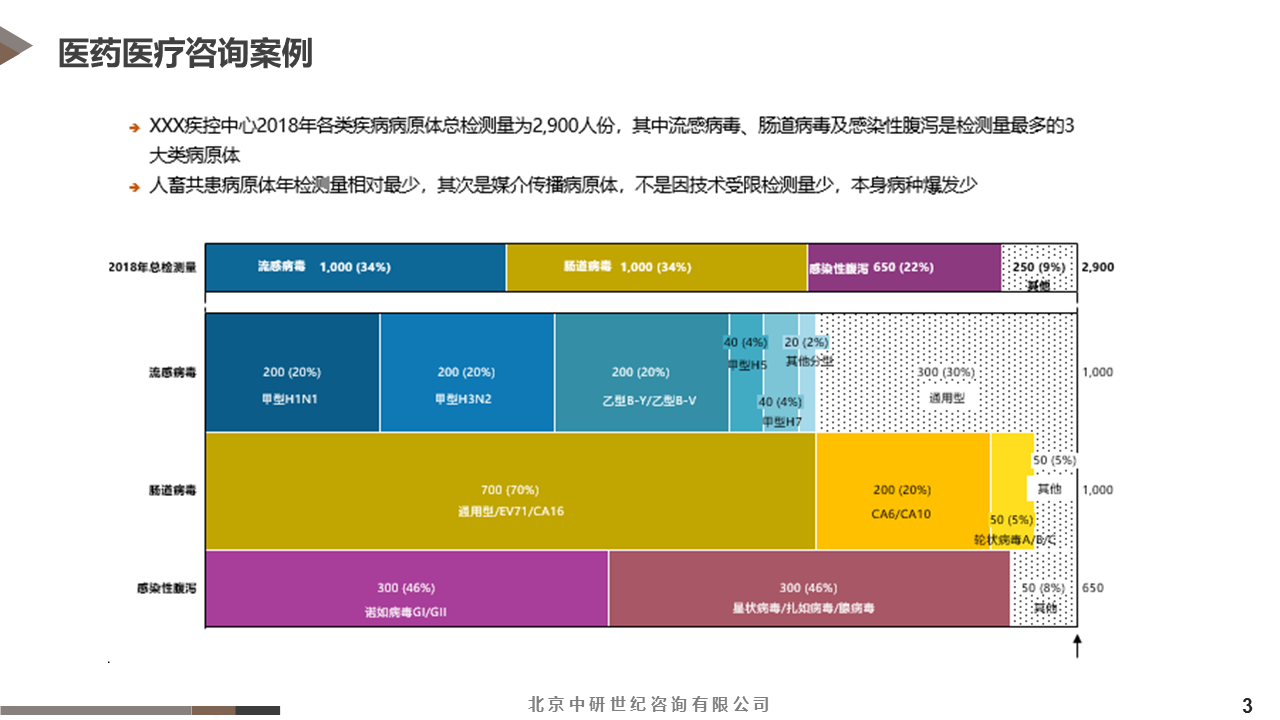 ①了解中國各區(qū)域、各級別疾控中心傳染性病毒或細菌檢測量級,及TOP檢測量大的病毒或細菌類型,再針對TOP檢測量大的病毒或細菌類型挖掘需要大的檢測試劑類型; ②了解中國各區(qū)域、各級別疾控中心對全自動檢測儀器現(xiàn)在及未來需求。