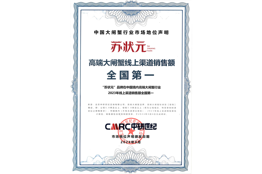 首頁 > 市場地位證明 > 蘇狀元大閘蟹銷量認(rèn)證