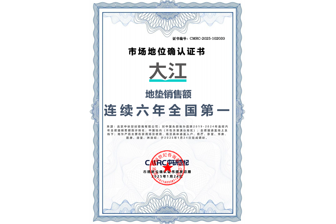 市場(chǎng)地位證明丨大江地墊銷售額連續(xù)六年全國(guó)第一認(rèn)證證書(shū)