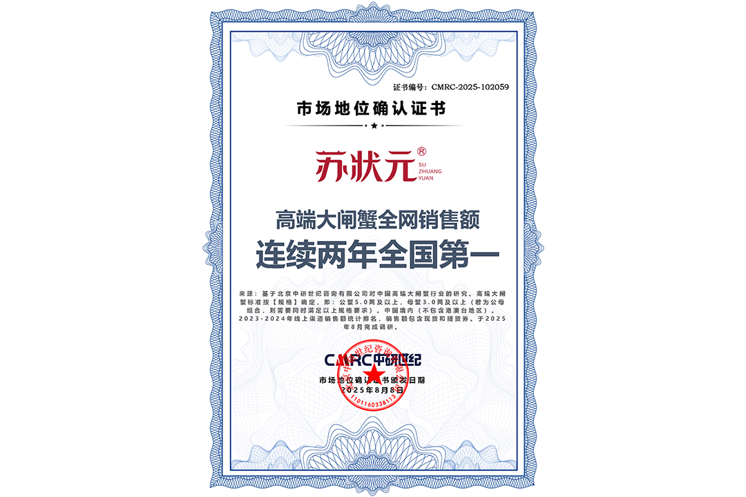 首頁 > 市場(chǎng)地位證明 > 市場(chǎng)地位證明丨蘇狀元-高端大閘蟹全網(wǎng)銷售額連續(xù)兩年全國(guó)第一