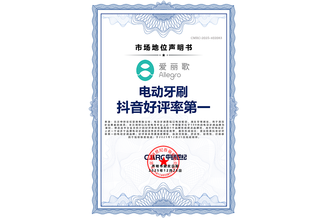 首頁 > 市場地位證明 > 市場地位證明丨愛麗歌-電動牙刷好評率第一市場地位聲明證書