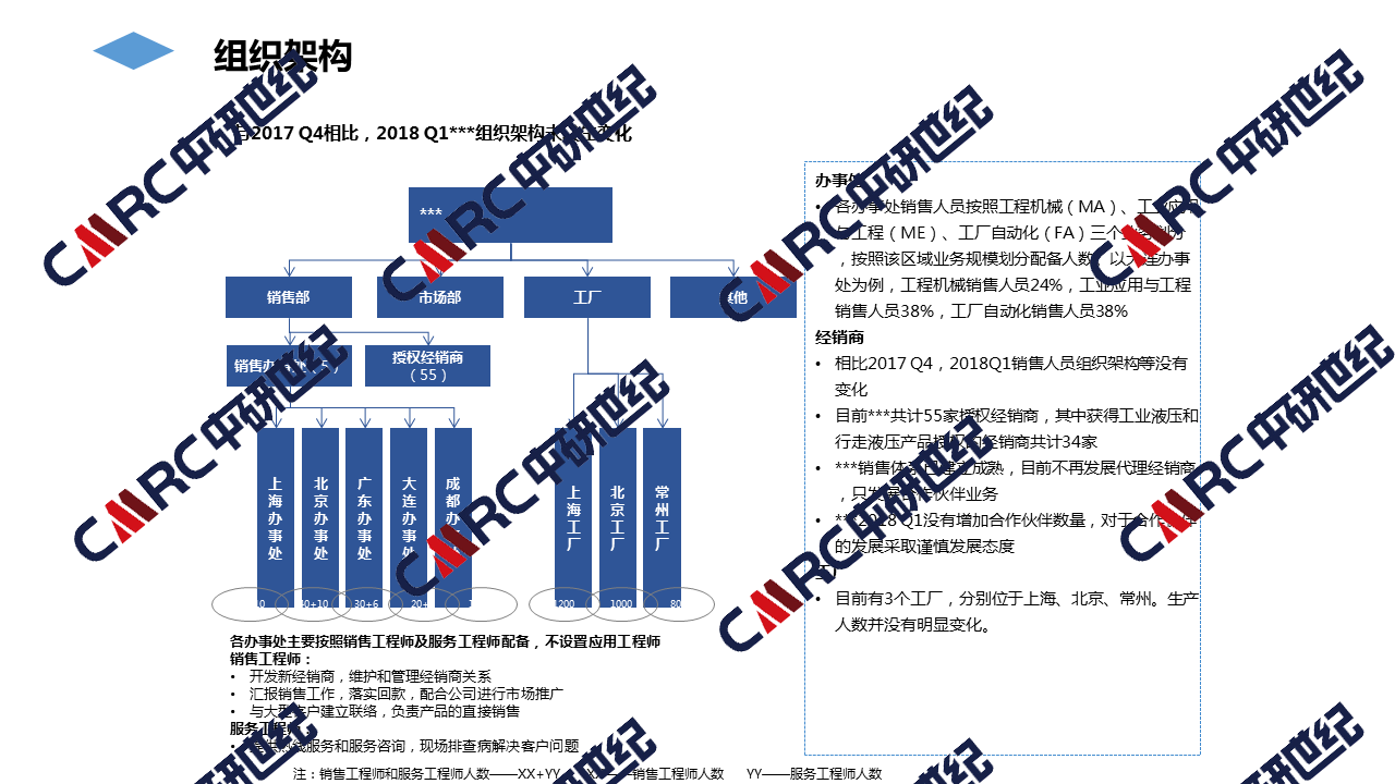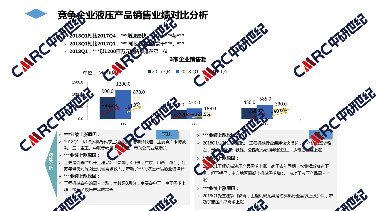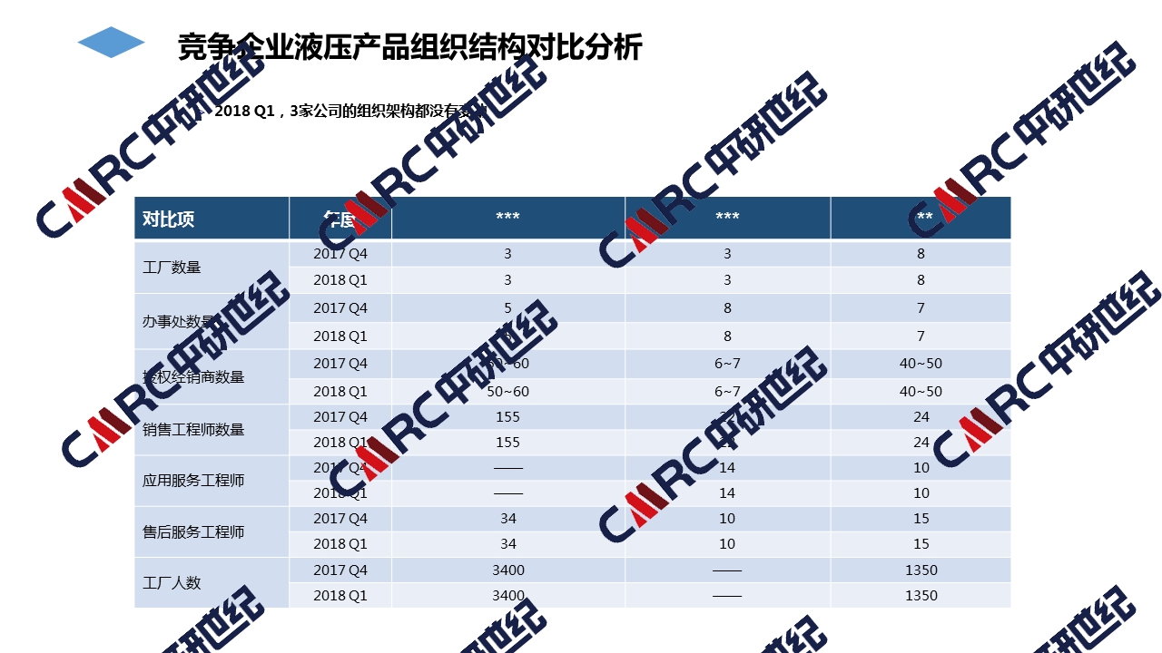 企業(yè)基本信息、液壓產(chǎn)品部門組織架構(gòu)及變化因素分析、生產(chǎn)基地分布及變化因素分析、人員數(shù)量結(jié)構(gòu)及變化因素分析、季度銷售業(yè)績及增長率、季度業(yè)績環(huán)比與同比增長情況分析,并對三家情況進(jìn)行對比分析。