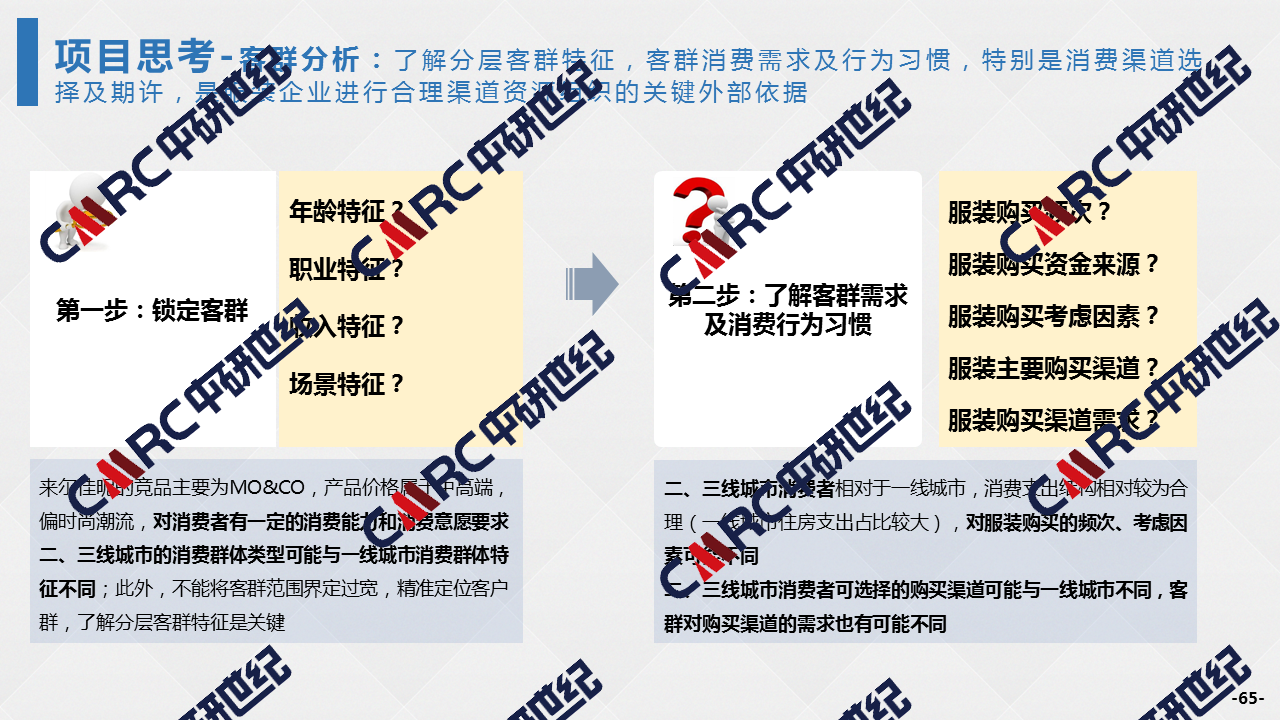 在CMRC營銷咨詢框架結構下,通過外部市場機會診斷、標桿企業(yè)借鑒,完成營銷咨詢方案設計: 委托方現(xiàn)有內外部資源及組織結構梳理及診斷 客群定位及消費場景確認(確定核心購買場所,整體市場目標主要解決購買場景問題) 廣東省二、三線城市,單一城市目標市場體量水平,確定未來營銷業(yè)績目標 城市為單位的營銷渠道設計結構和銷售業(yè)績承擔(建立營銷組織機構與業(yè)績目標的對接) 廣東省二、三線城市,主要渠道資源,渠道資源獲取辦法、渠道管理辦法 標桿企業(yè)營銷業(yè)績/營銷渠道/營銷管理分析