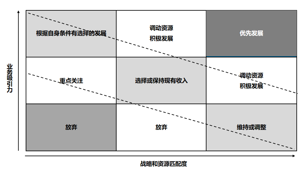 4最終以業(yè)務(wù)吸引力及戰(zhàn)略和資源匹配度兩個(gè)維度出發(fā),通過業(yè)務(wù)選擇矩陣來確定未來的戰(zhàn)略定位與發(fā)展方向